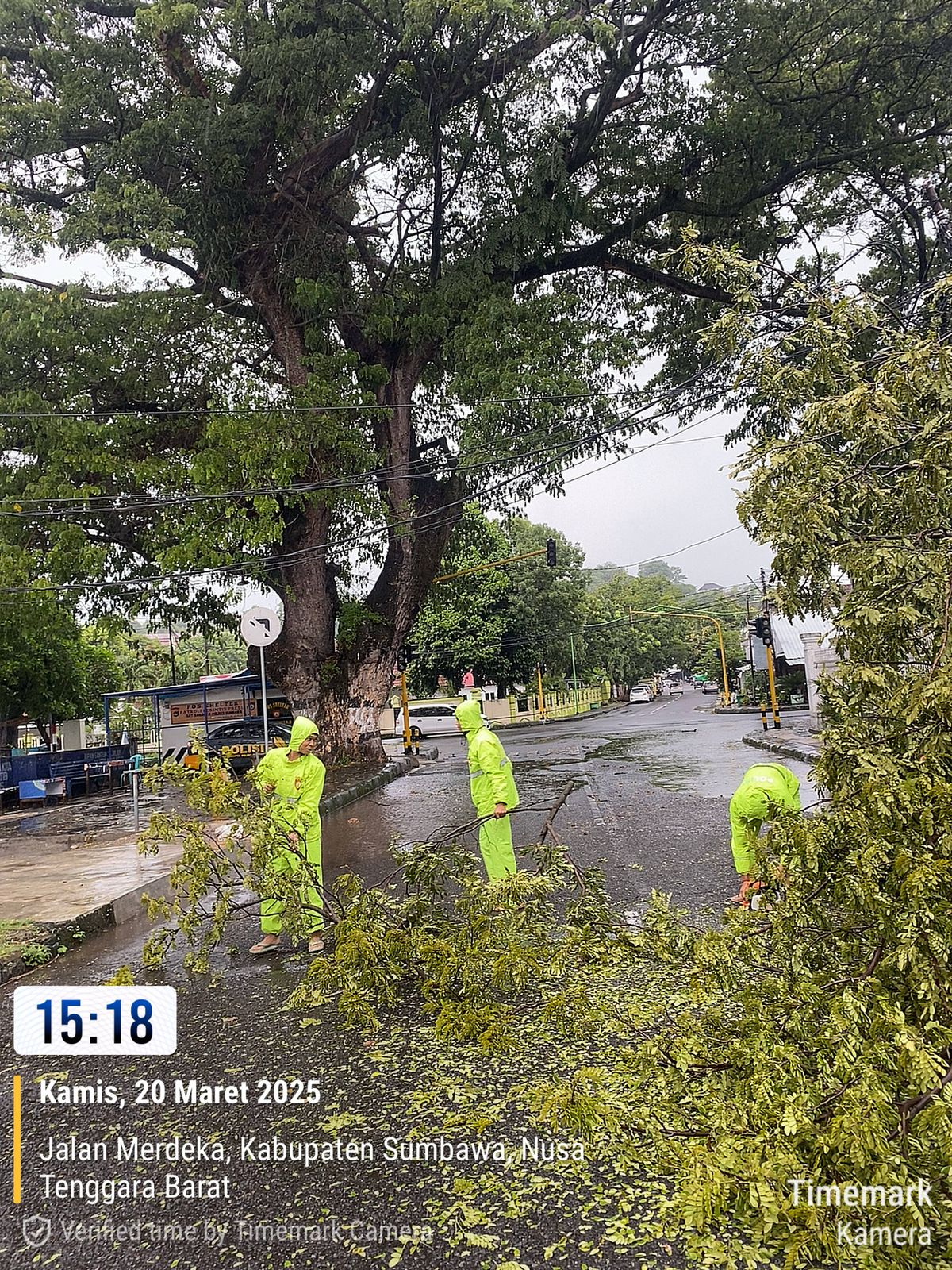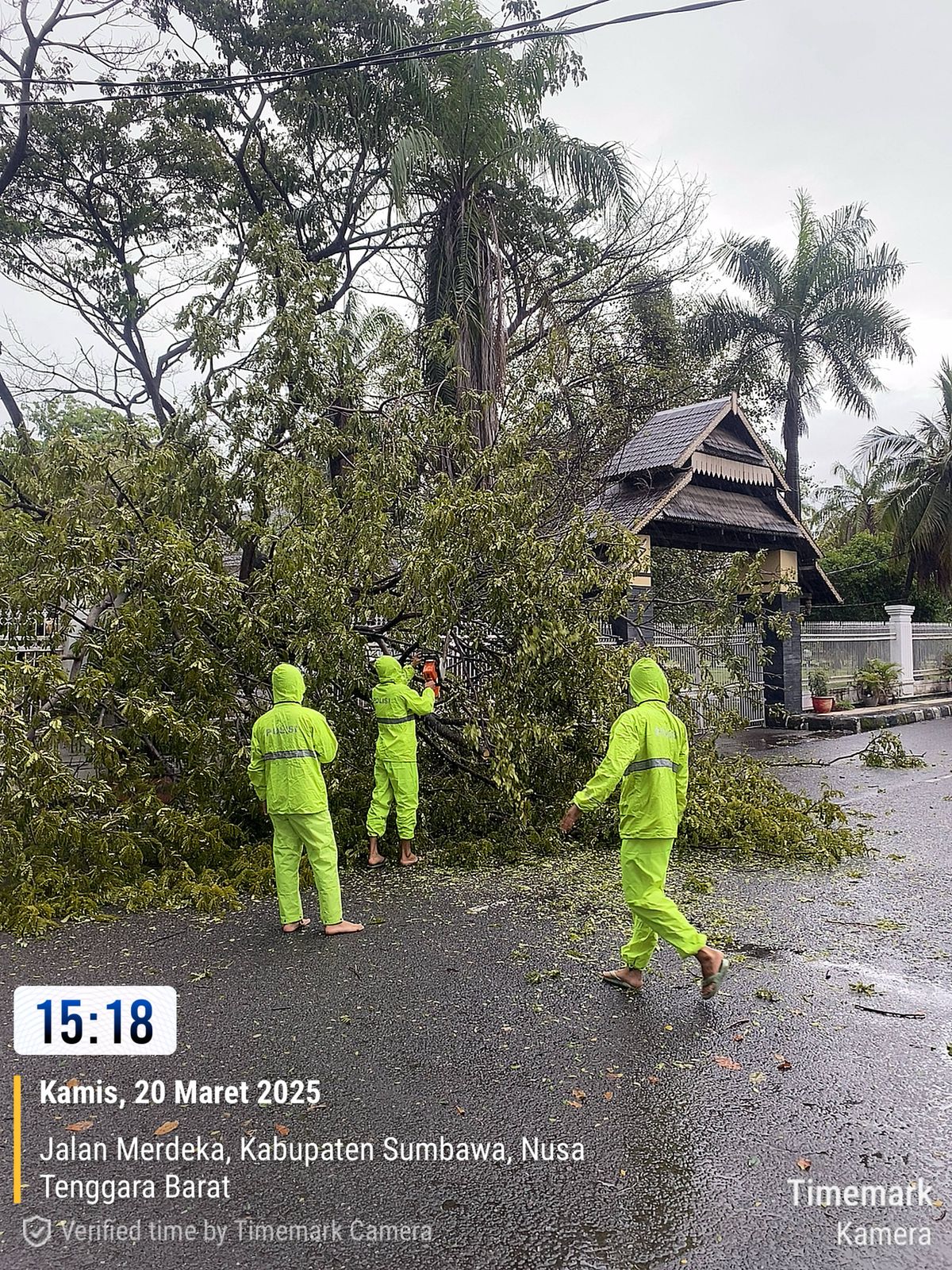 Sumbawa Besar-NTB, Kejadian pohon tumbang di Jalan Merdeka Sumbawa, tepatnya di area Taman Pahlawan, segera ditangani dengan cepat oleh personel Samapta Polres Sumbawa pada Kamis sore, 20 Maret 2025 sekitar pukul 15.18 WITA. Beruntung, tidak ada korban jiwa dalam peristiwa tersebut, pohon tersebut diketahui merupakan salah satu pohon besar dan tua yang ada di Pendopo kediaman Bupati Sumbawa.